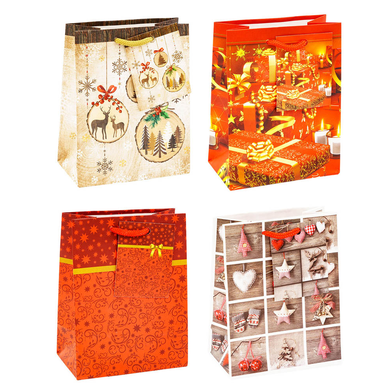 Die TSI Geschenktaschen kommen in 4 unterschiedlichen weihnachtlichen Motiv-Varianten zu Ihnen (je 3 Taschen pro Motiv).
