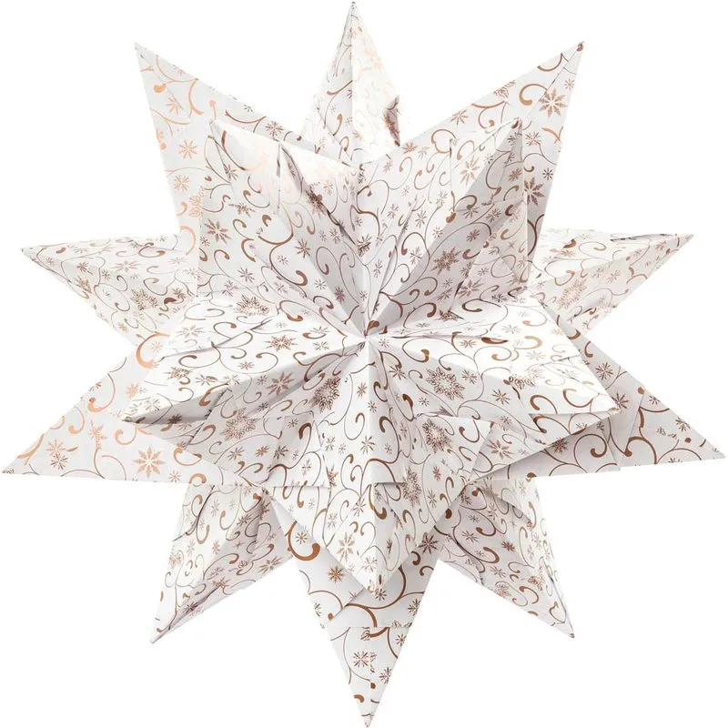 Erstellen Sie mit den folia Faltblättern Bascetta-Stern Eisblume wunderschöne Sterne, die eine zauberhafte Atmosphäre verbreiten. Dieses exquisite Set enthält 32 Blatt hochwertiges Transparentpapier im Format 20,0 x 20,0 cm, kunstvoll verziert mit eleganten weißen und kupferfarbenen Eisblumen-Ornamenten. Es ist ideal für festliche Dekorationen, kreative Bastelprojekte oder als persönliches Geschenk.