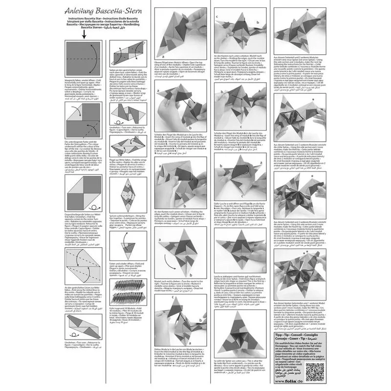 Die Faltblätter von folia sind 'Made in Germany' und garantieren eine hervorragende Qualität sowie beste Faltbarkeit. Mit einem Papiergewicht von 115 g/qm sind sie stabil genug für präzises Falten und dennoch optimal transparent, um das charakteristische, bezaubernde Leuchten der Bascetta-Sterne zu erzeugen. Die Blätter haben eine handliche Größe von 10,0 cm, ideal für die filigrane Mini-Ausführung der Sterne.