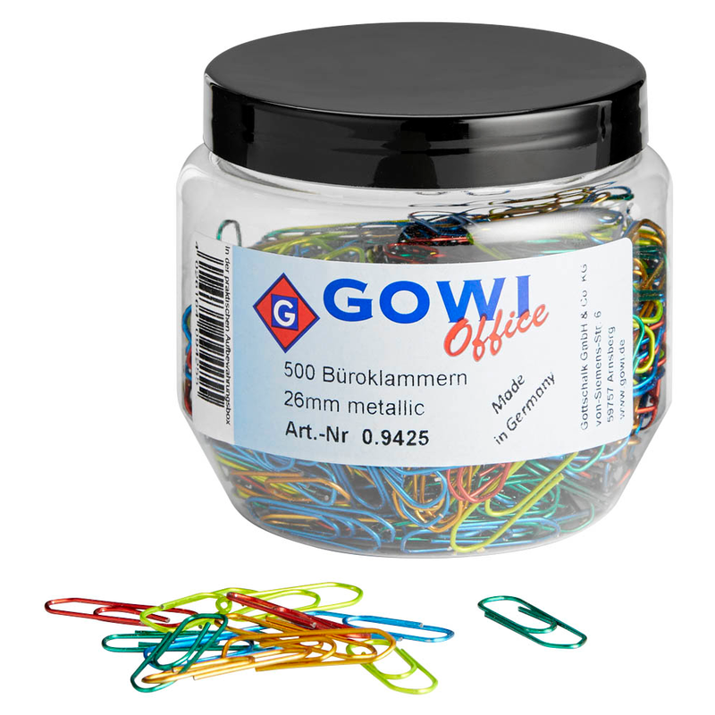 Die farbsortierten Gowi Büroklammern halten zusammen, was zusammengehört. Im Büro unverzichtbar, aber auch in der Schule, beim Studium oder im Haushalt finden diese bunten Helferlein immer eine Aufgabe.