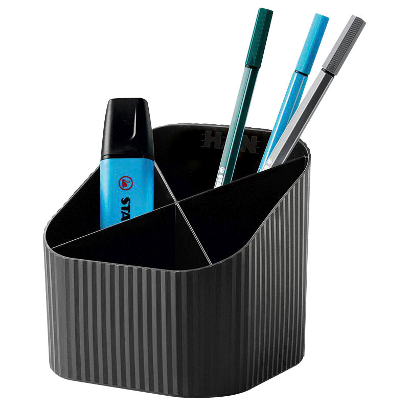 Schaffen Sie sich Platz auf Ihrem Schreibtisch. Ob Stifte, Büroklammern oder Schere – mit dem HAN Re-X-LOOP Stiftehalter in schwarz haben Sie immer schnellen Zugriff auf Ihre Schreib- und Arbeitsutensilien. Zudem besteht der Kunststoff des Halters zu 100% aus Recycling-Material.