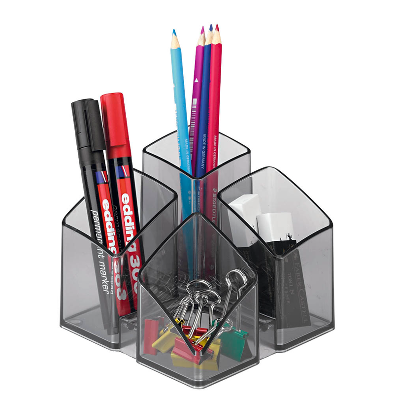 Der Stiftehalter SCALA bietet schnellen Zugriff auf Ihre Schreibutensilien und erspart Ihnen langes Suchen in Schreibtischschubladen. Seine 4 unterschiedlich großen Köcher nehmen von Büroklammern über Radiergummi bis hin zu Textmarkern und Kugelschreibern alles auf.