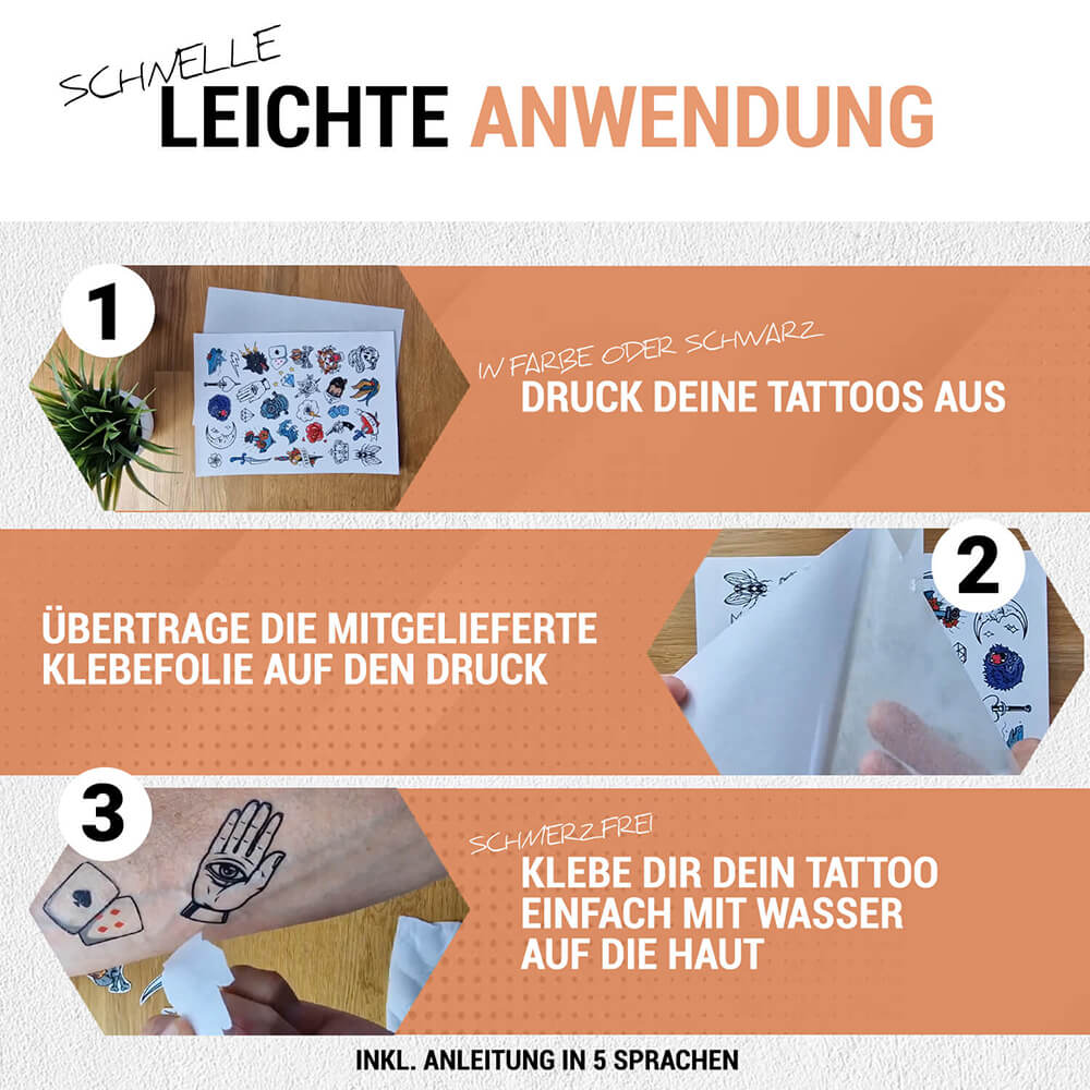 KINDERLEICHT MIT JEDEM LASERDRUCKER - VON DER IDEE ZUM LEUCHTENDEN TATTOO - Einfach dein Wunschmotiv mit einem Inkjet-Drucker auf die spezielle Transferfolie drucken und mit der beiliegenden Schritt-für-Schritt-Anleitung in Minuten auf die Haut übertragen. Perfekt für Familien mit Heimdruckern - keine teuren Spezialgeräte nötig, nur Wasser, Kreativität und dein vorhandener Laserdrucker für professionelle Ergebnisse.