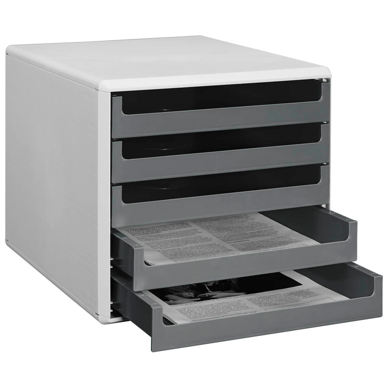 Die M&M Ablagebox verfügt über fünf Schubladen, die individuell entnommen werden können. Dies ermöglicht eine flexible Organisation und einen einfachen Zugriff auf Ihre Dokumente. Ob wichtige Unterlagen, Büromaterial oder persönliche Gegenstände – in diesen großzügigen Fächern findet alles seinen Platz. Mit Innenmaßen von 24,3 x 33,3 x 4,0 cm pro Schublade sind Ihre DIN A4-Dokumente optimal aufbewahrt.