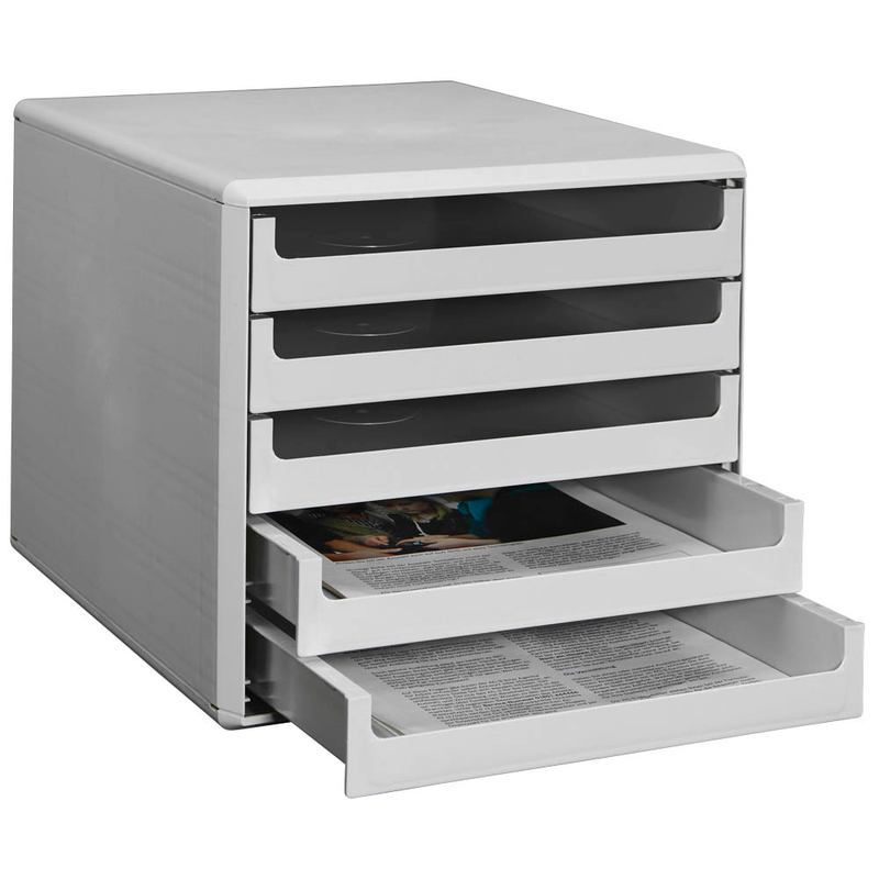 Die M&M Ablagebox, Modell 30050909, ist die ideale Lösung, um Ordnung und Übersicht in Ihre Schreibtischumgebung zu bringen. Mit fünf Schubladen in Lichtgrau bietet sie ausreichend Platz für Ihre DIN A4 Unterlagen und setzt gleichzeitig einen stilvollen Akzent.