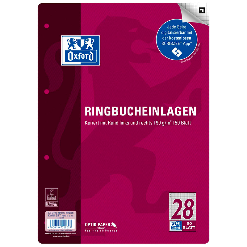 Marke OXFORD Produktart Ringbucheinlagen Ausführung der Lineatur kariert Rand Innen- und Außenrand Papierfarbe weiß Lochung 4-fach-Lochung Papiergewicht 90 g/m² Bleichung elementar chlorfrei gebleicht (ECF) holzfrei Ja Recycling-Papier Nein Blätter pro Satz 50 Blatt Format A4 Lineatur 28