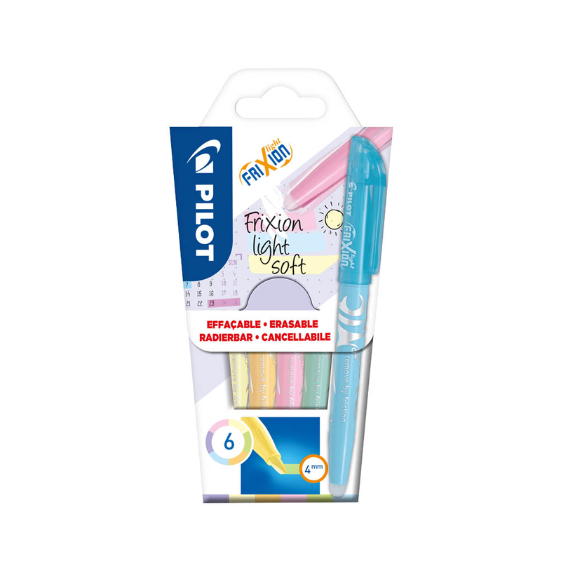 Die PILOT FriXion Light Soft Textmarker farbsortiert sind die perfekte Wahl, wenn Sie Textpassagen, Stichwörter oder wichtige Zahlen markieren möchten. Markierte Stellen springen sofort ins Auge - und das Besondere: Fehlerhafte Markierungen können mit der Gummispitze am Schaftende einfach wegradiert werden!