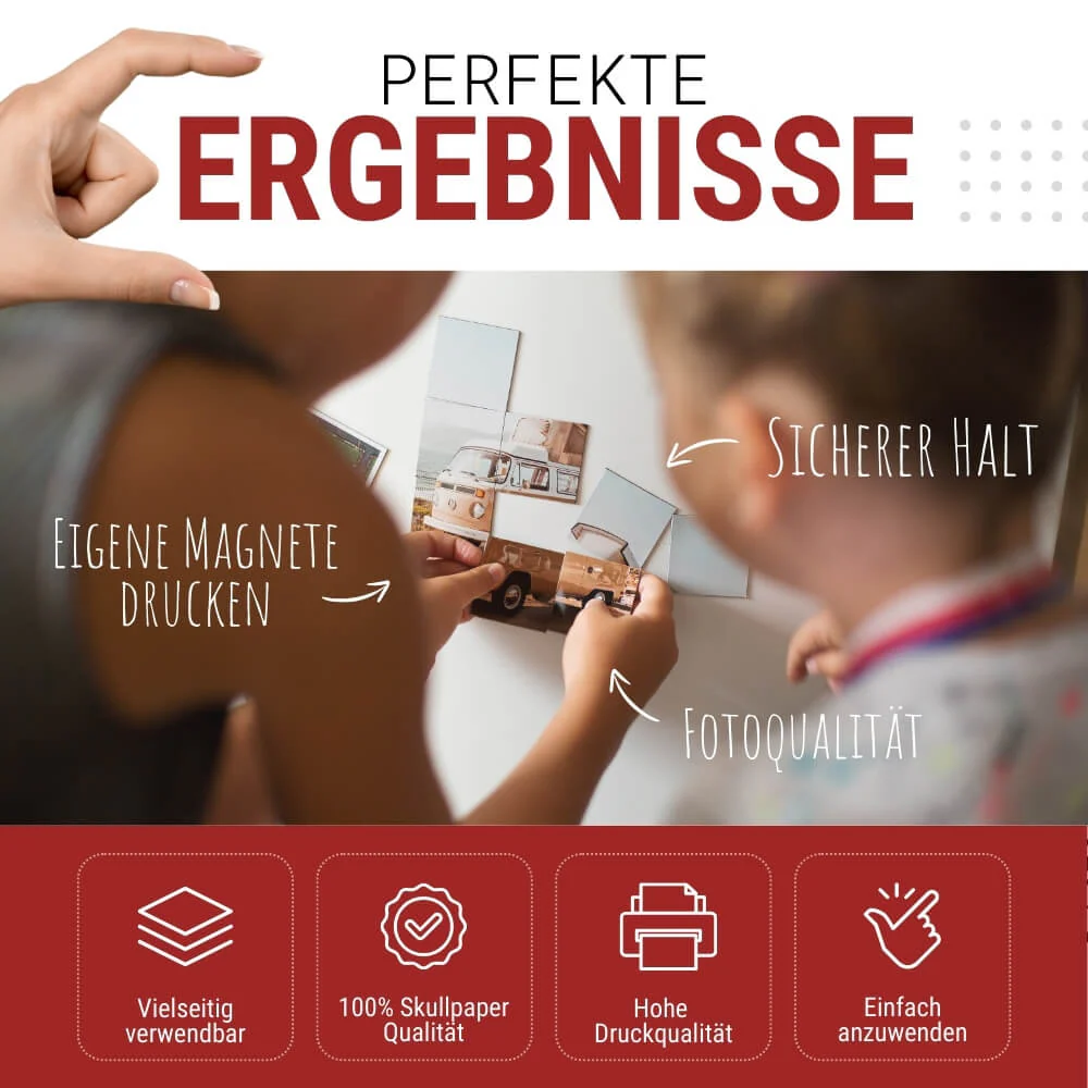PREMIUM SKULLPAPER-QUALITÄT – 10 A4-BLÄTTER FÜR UNZÄHLIGE PROJEKTE – Deutsche Markenqualität mit glänzender Premium-Fotoqualität und hervorragender Haltbarkeit des Druckbildes. Eine Packung reicht für dutzende individuelle Magnetschilder oder große Projekte. Perfektes Geschenk für Bastler, Büros, Familien oder alle, die funktionale und dekorative Magnetlösungen selbst gestalten möchten. Bewährt bei über 50.000 zufriedenen Kunden deutschlandweit.
