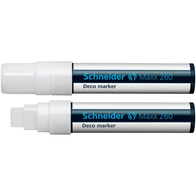 Der Schneider Maxx 260 Kreidemarker weiß erzeugt ein mattes, aber kraftvolles Schriftbild und lässt sich ganz einfach wieder von glatten Oberflächen abwischen. Die hochdeckende Tinte bietet ein kreideähnliches Aussehen, das sehr stylisch wirkt.