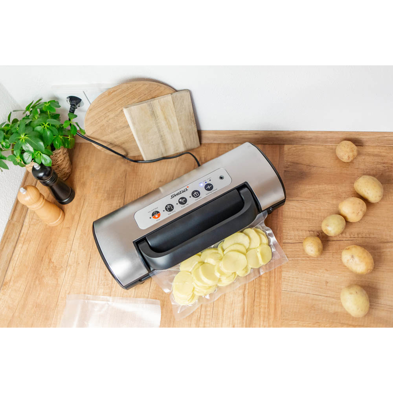 Entdecken Sie das Steba VK 12 DOUBLE SEAL Vakuumiergerät in Silber - die einfache und effektive Möglichkeit, Lebensmittel luftdicht zu verpacken und deren Haltbarkeit zu verlängern. Größere Mengen können problemlos konserviert und vor Gefrierbrand geschützt werden.